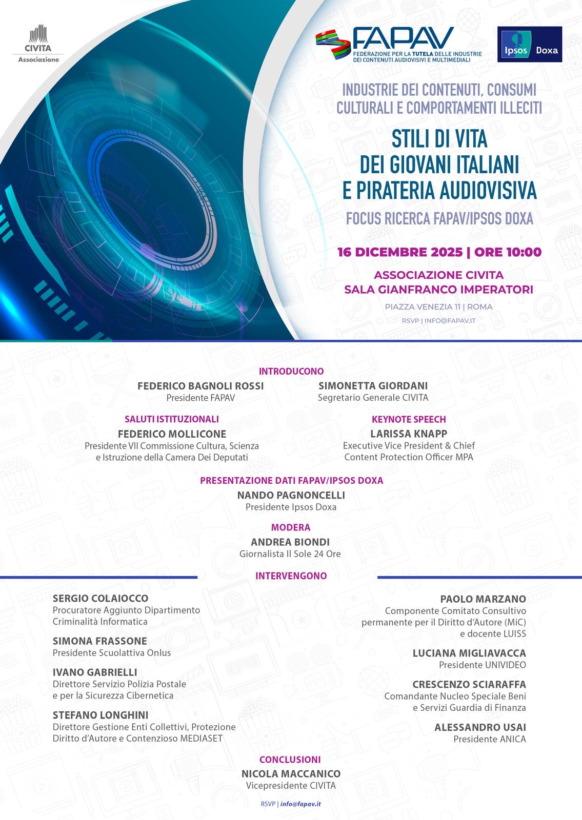 Martedì 16 dicembre, presso l’Associazione CIVITA (Piazza Venezia 11, Roma), sarà presentato lo Studio FAPAV/Ipsos Doxa su “Stili di vita dei giovani italiani e pirateria audiovisiva”.